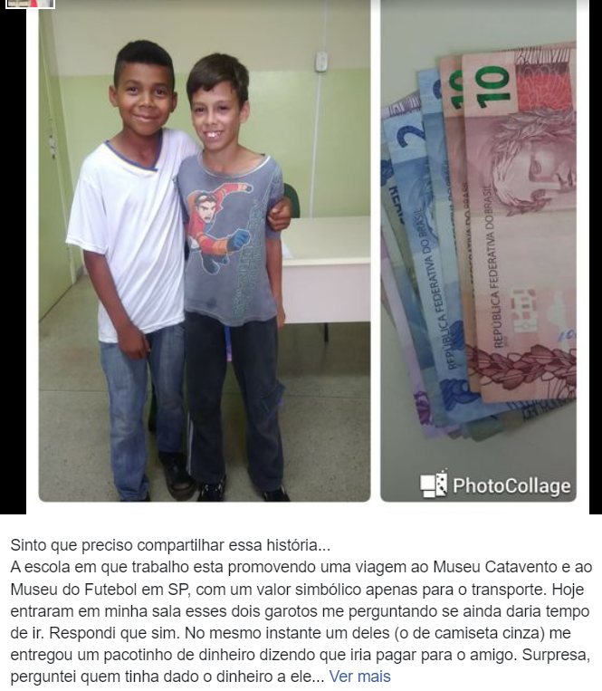 Um gesto de amizade entre dois estudantes emocionou funcionários de uma escola municipal de Bragança Paulista (SP). Matheus Monteiro, de 12 anos, juntou todo dinheiro que ganhou de aniversário para pagar a ida do amigo Iago a uma excursão da escola. Ele não poderia pagar pelo passeio e o caso viralizou na web ao ser compartilhado pela diretora.