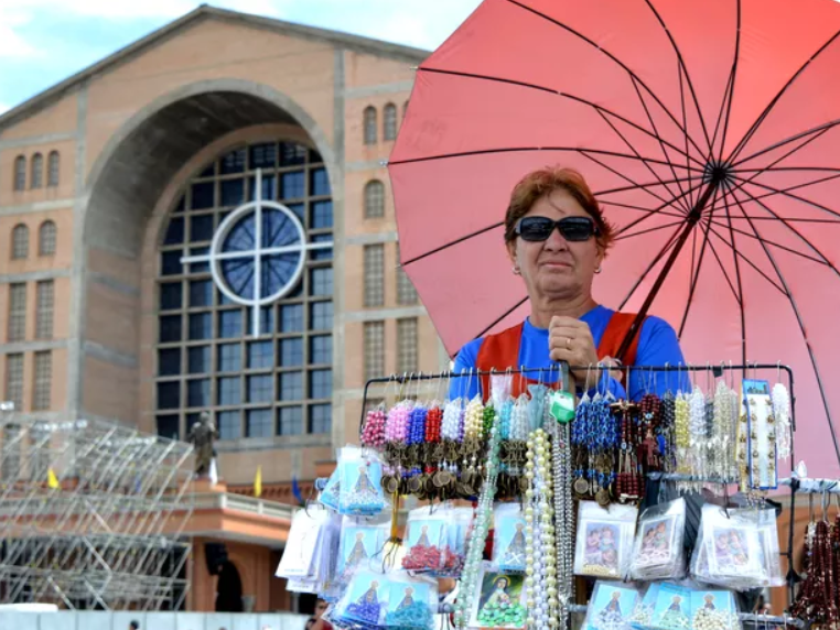 Elas vendem no pátio da basílica artigos religiosos feitos à mão. Mulheres propagam símbolos de fé e devoção à Aparecida.
